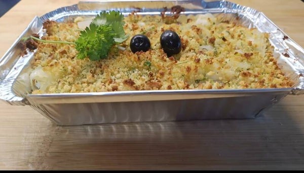 Succulent flakes of codfish confit in onion sauce, baby potatoes in the oven, spinach sautéed in garlic and olive oil. Topped with cornbread, yummi