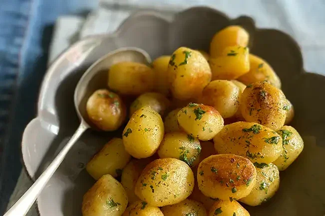 Pieces of chicken breast with mushrooms, port wine and cream. Served with sautéed potatoes and rice.