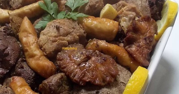 Pedaços de carne de porco ,fritos na sua gordura, tripa frita, redenho ,acompanhado com batata frita e arroz de sarrabulho